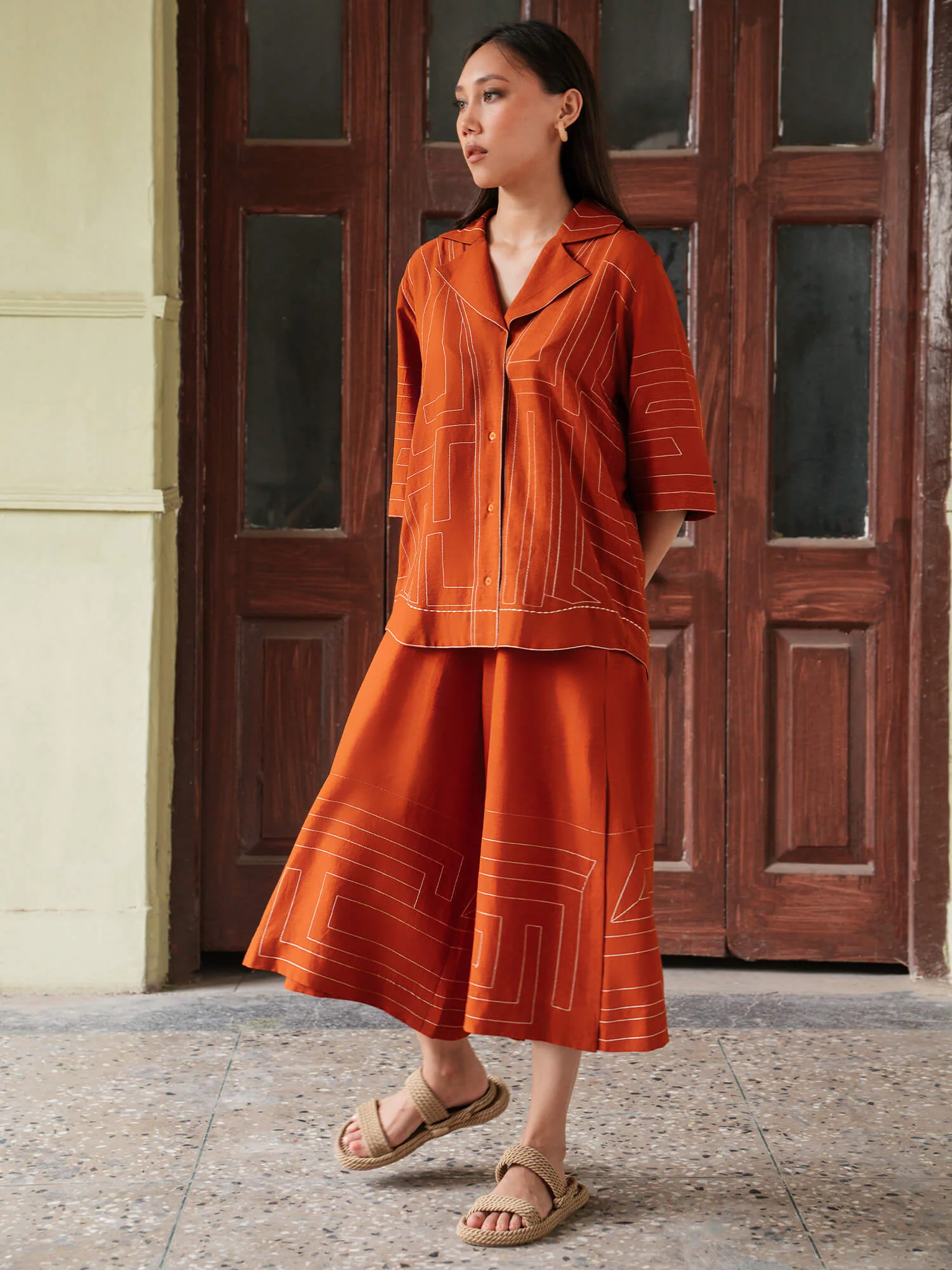The Luna set in rust is effortlessly stylish for anytime of the day. It features single aari linear architectural lines, adding to its allure. Paired with matching culottes with a slit, this set will be your go-to look this season.