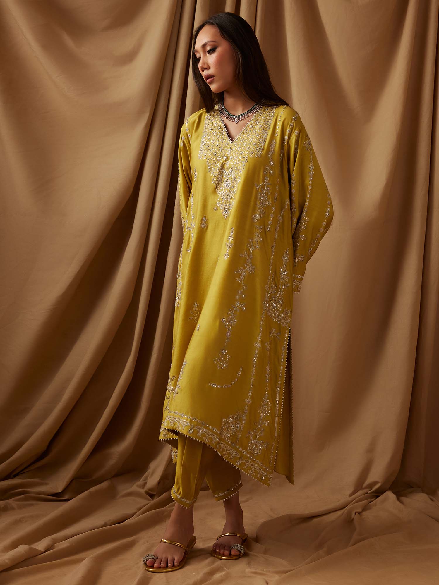 Crafted from mustard yellow khaddi silk, this Malta kurta showcases multi hued resham embroidery inspired by Mughal floral motifs. It is paired with matching raw silk skinny shalwar and is sure to be a festive wardrobe favorite.