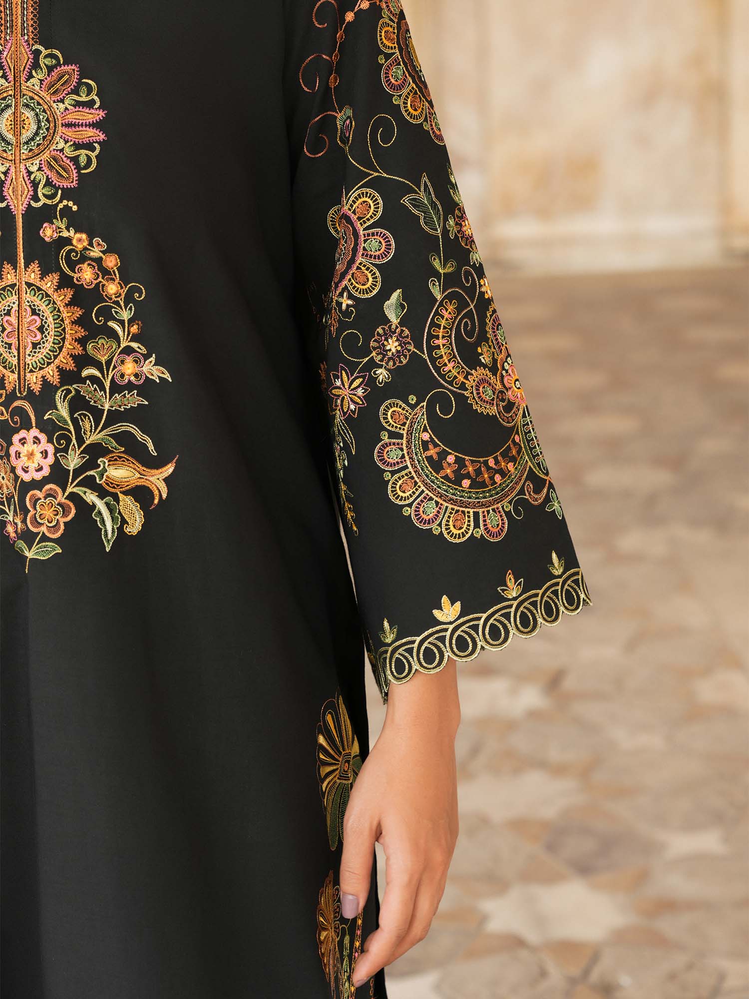 “Nera” is crafted on a sleek black base with gothic-inspired tropical floral embroidery and a central ornate medallion, complemented by a glowing amber-orange medium silk dupatta and embroidered trouser borders for a modern statement look.
