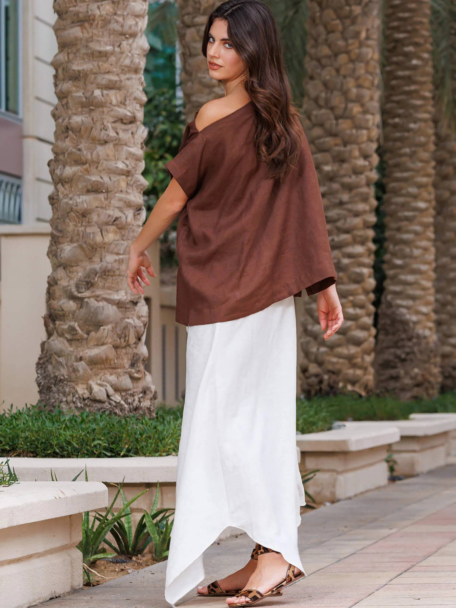 Summer ready silhouettes, perfect for the months ahead. Our chocolate brown off-shoulder linen top boasts a unique cerulean print to make a statement and can be styled in a myriad of ways. We like it best paired with our pinch skirt for a complete look.Â
