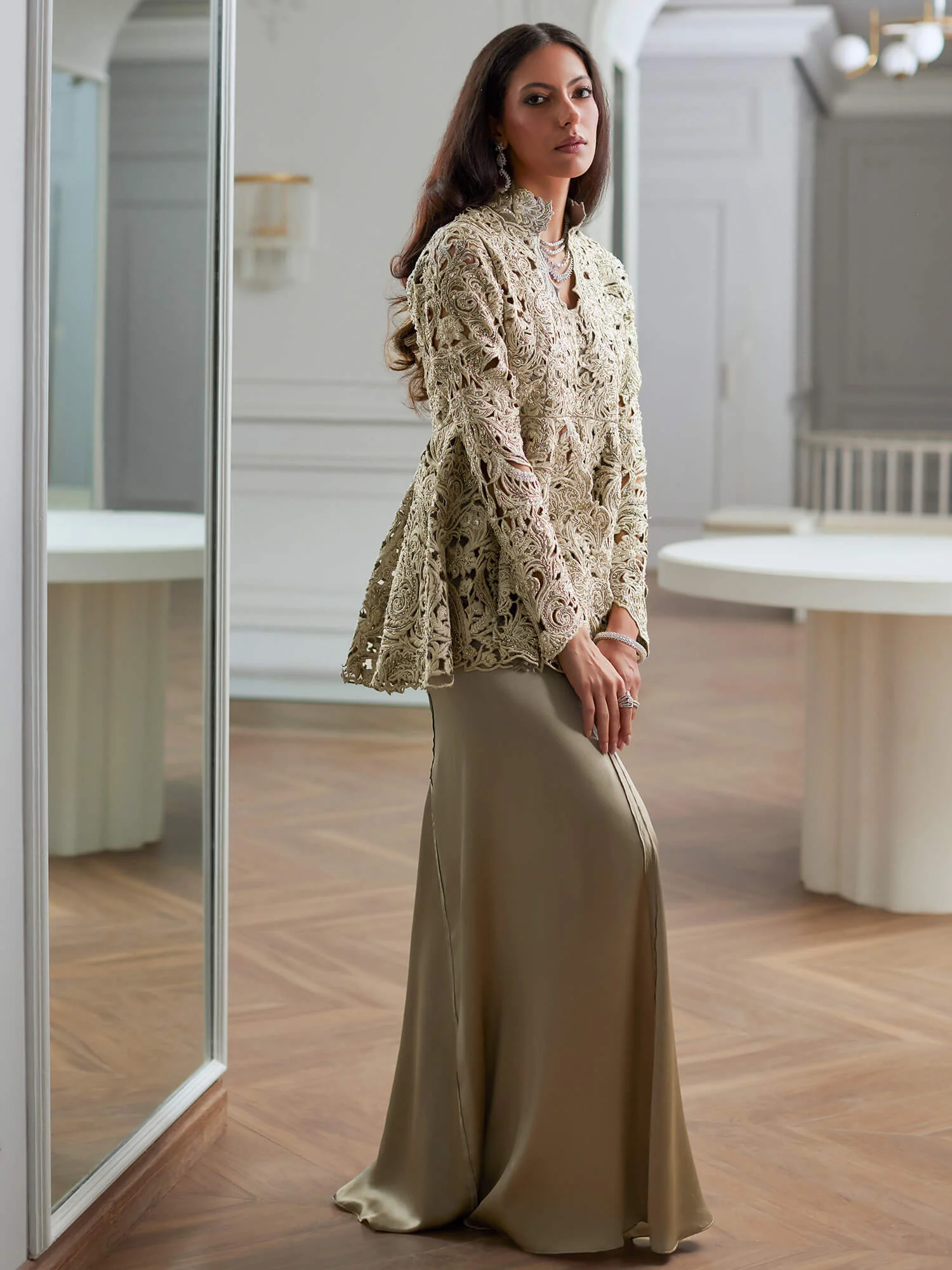 Step into the new season with our elegant charcoal grey Peplum in tissue, paired with our lolita skirt. Adorned with delicate resham, cutwork, and zardozi details, this striking ensemble is the perfect silhouette for the season.