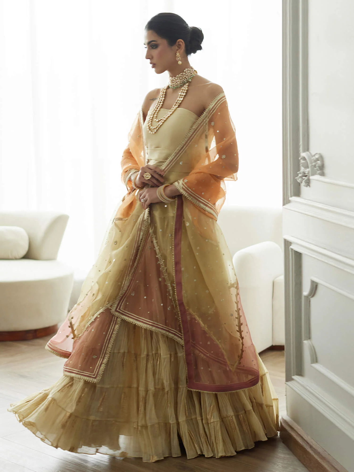 This head-turning evening edit is the perfect style for your best friend’s wedding or cousins nuptials. It features a sand woven foil lehenga and a strapless top paired with a color blocked organza dupatta featuring zardozi accents, perfect for the modern woman on the go.