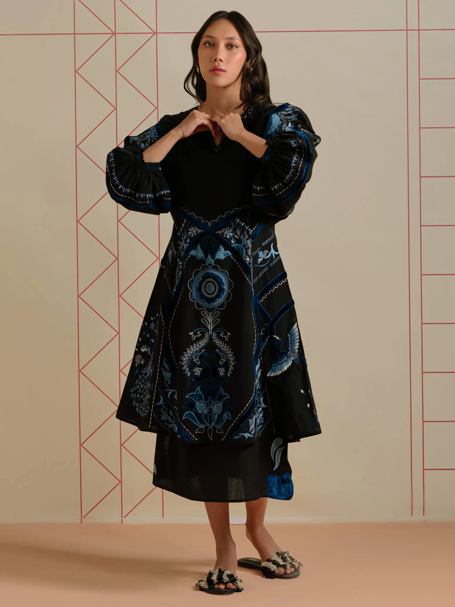 Cut from linen, our black Zainy features fine single aari embroidery in monochrome tones of blue, coupled with velvet applique all over. It is further elevated with crafted stitches on the neckline and sleeves. Perfect for your holiday rotation.